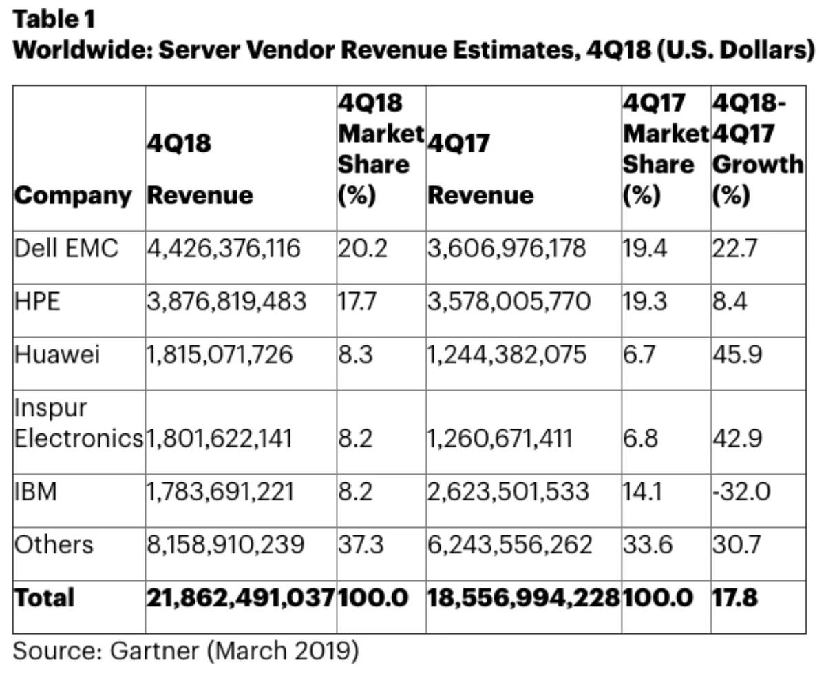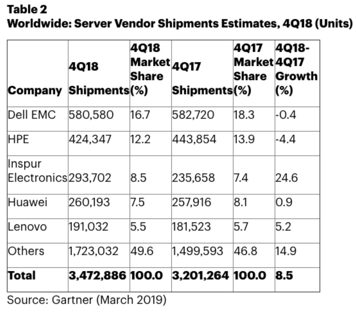 And it was similar results for server shipments for the quarter, with Dell EMC maintaining its place at the top with a 16.7 percent market share, followed by HPE with 12.2 percent. Both these vendors underwent declines over the quarter, while Inspur Electronics experienced the strongest growth with a 24.6 percent increase in shipments in the fourth quarter of 2018.