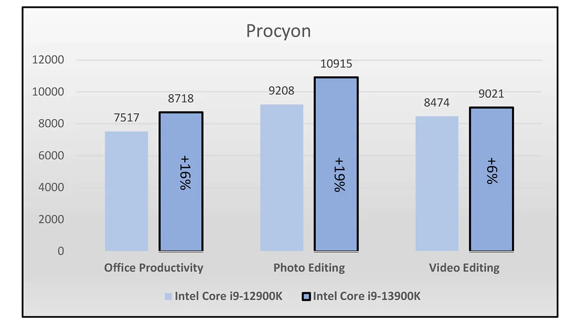 Procyon, which uses Microsoft Office and Adobe applications for real-world tests had gains of 16% for office productively, 19% for photo editing, and 6% for video editing. PC Mark 10 gave the Intel Core i9-13900K a score 8% higher than the Core i9-12900K, with 5% gains for essentials, 8% for productivity, and 11% for digital content creation.