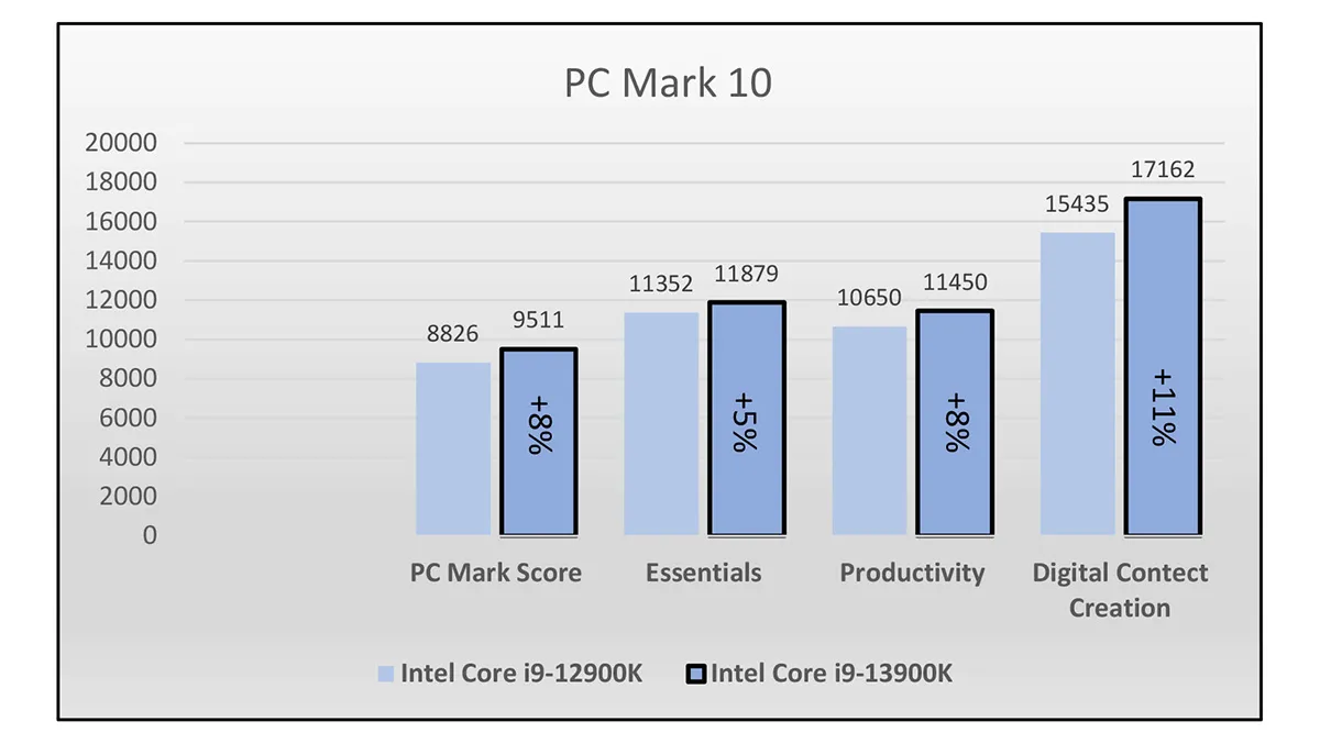 Crossmark recorded the Intel Core i9-13900K as having a 13% overall performance increase over the Core i9-12900K. The gain for creativity was 17%, productivity 11%, and responsiveness 8%.