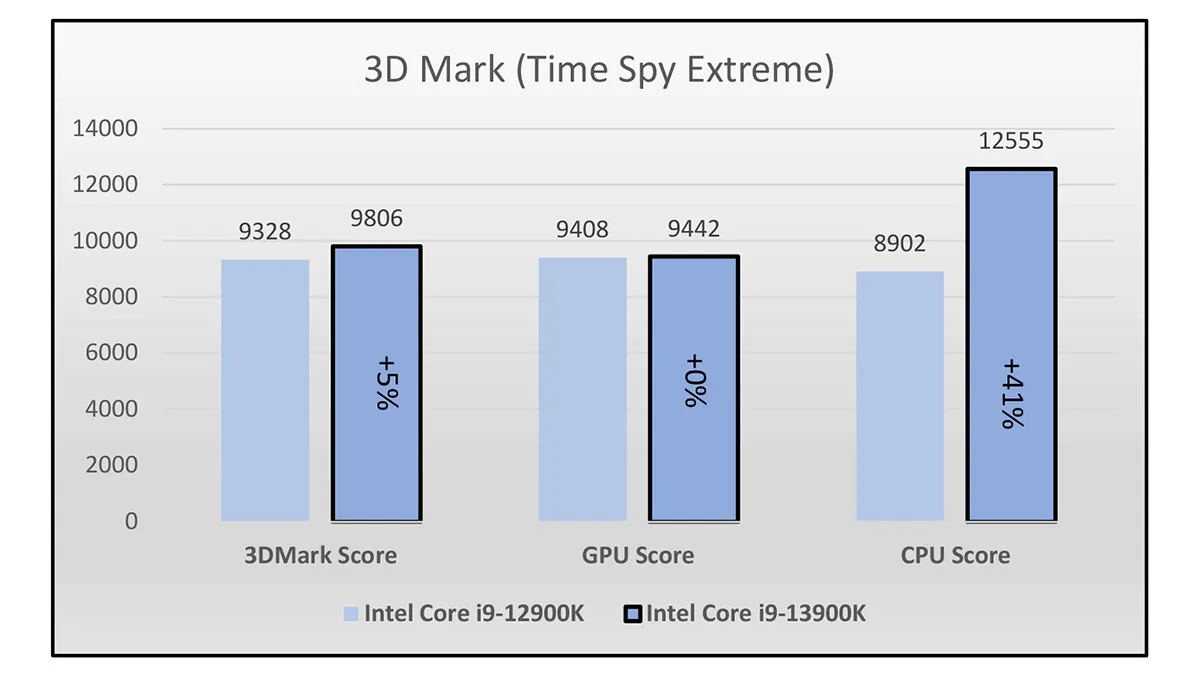 The 3D Mark Time Spy Extreme benchmark is really a GPU test rather than for a CPU, but it does serve to illustrate the potential performance effect of a more powerful CPU when playing games. The overall 3D Mark score showed a 5% increase for the new CPU over its predecessor.